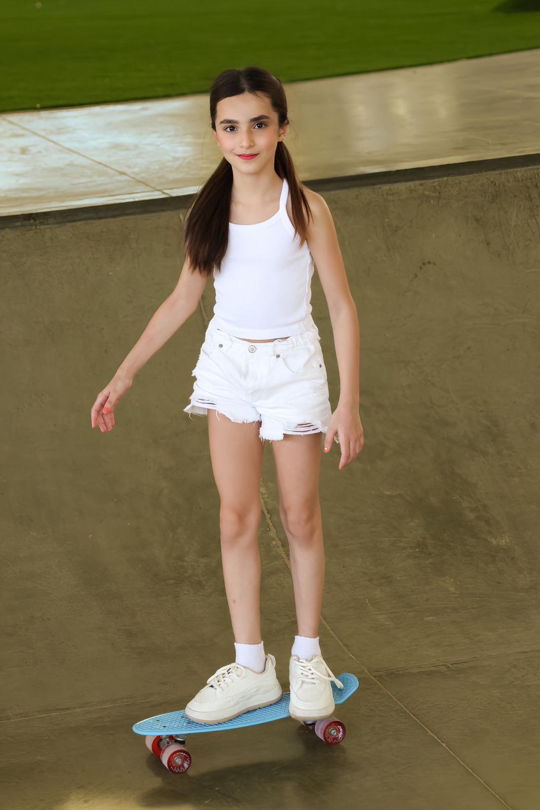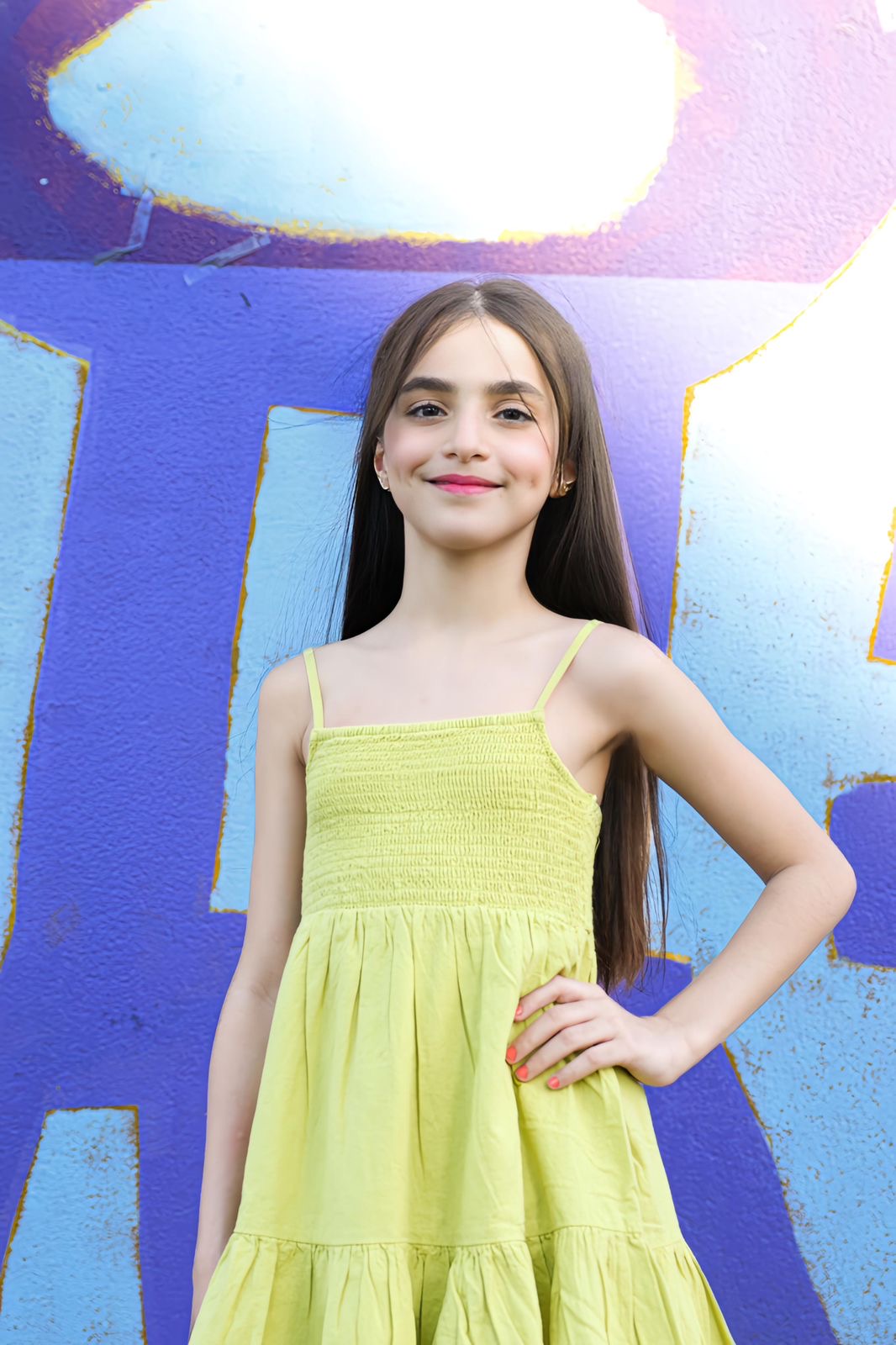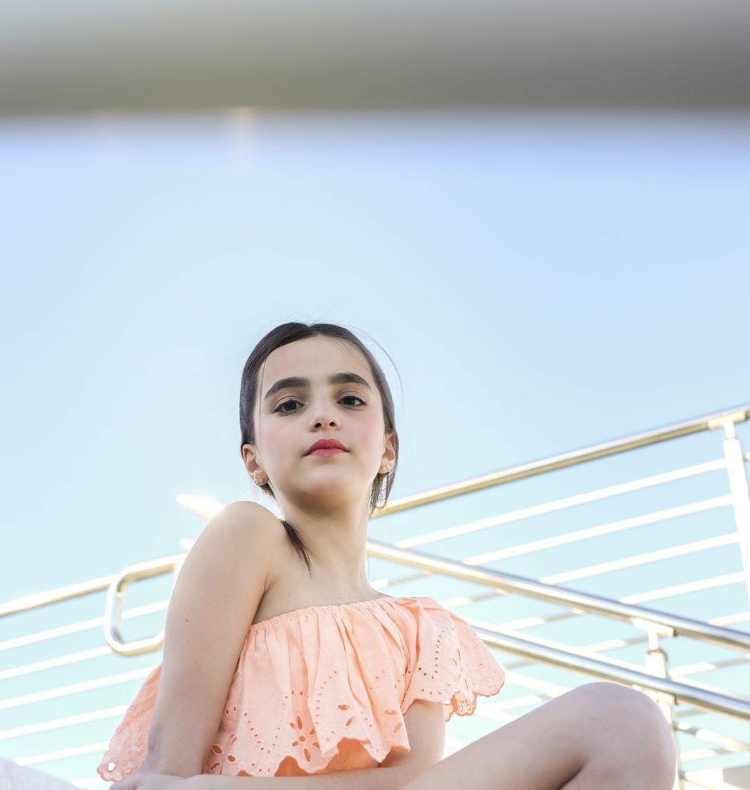 Talented model, high level gymnast, energetic young girl, shining smile